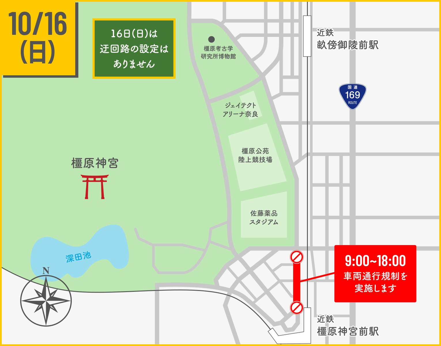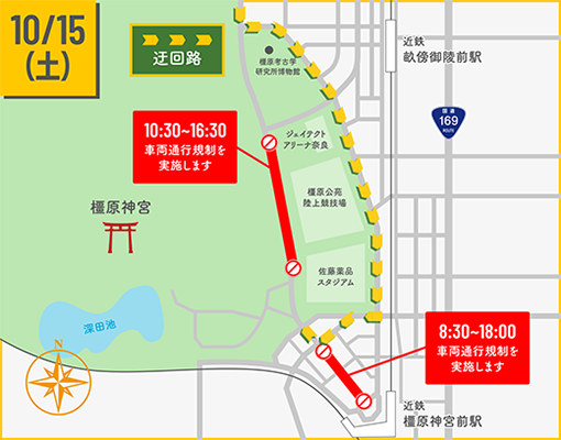 フェスティバルの開催に伴い、以下の通り周辺道路において交通規制を実施いたします。交通規制実施時間においては周辺道路の混雑が予想されます。